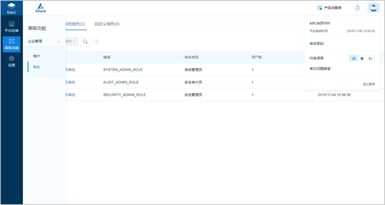 ZStack 3.7.0新增三员分立权限管理,将超级管理员(admin)权限分解并赋予系统管理员、安全管理员和安全审计员。其中,系统管理员负责云平台资源管理、安全管理员负责云平台权限管理、安全审计员负责云平台审计管理,三者之间相互独立,相互制约。