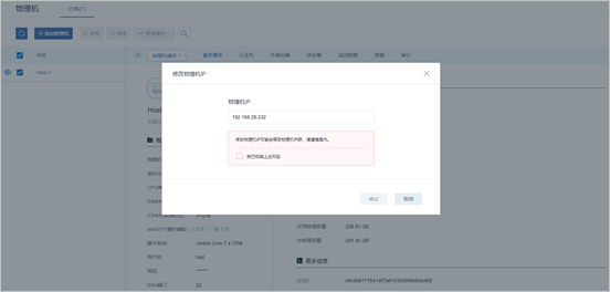 在ZStack 3.7.0中,修改物理机IP给出危险提醒。修改物理机IP可能导致物理机失联,对正在运行的业务带来影响,需谨慎操作。
