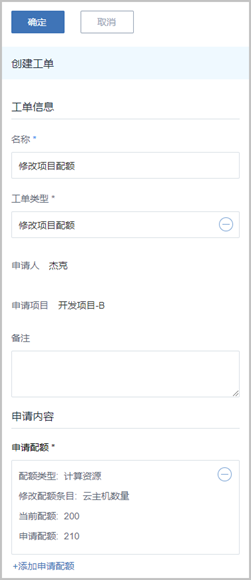 在ZStack 3.7.0中,工单类型新增支持修改项目配额,允许修改项目内所有配额条目。目前支持使用默认流程(提交àadmin)提交修改项目配额类型的工单。