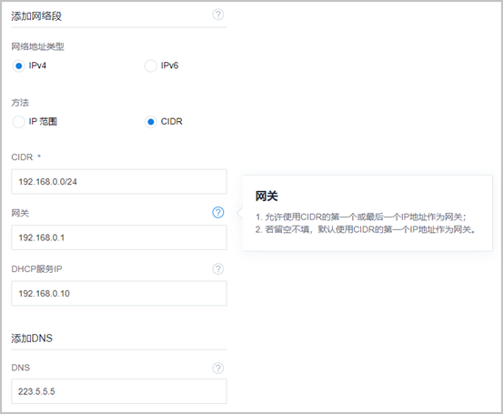 - 网络CIDR支持指定网关(目前支持IPv4)