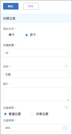 ZStack 3.7.0支持批量创建云盘,用户指定所需云盘规格后,可批量创建相应云盘,最大允许一次性批量创建24块云盘。支持批量创建的云盘类型包括:普通云盘、共享云盘(包括:基于Ceph主存储的共享云盘、基于厚置备的Shared Block主存储的共享云盘)。