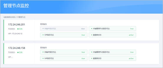 ZStack 3.7.0支持双管理节点高可用监控与健康状态检查,UI界面展示项有:管理节点IP、管理节点状态、VIP、管理服务状态(包括:仲裁IP是否可达、对端管理节点是否可达、VIP是否可达、数据库状态)。
