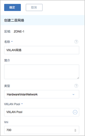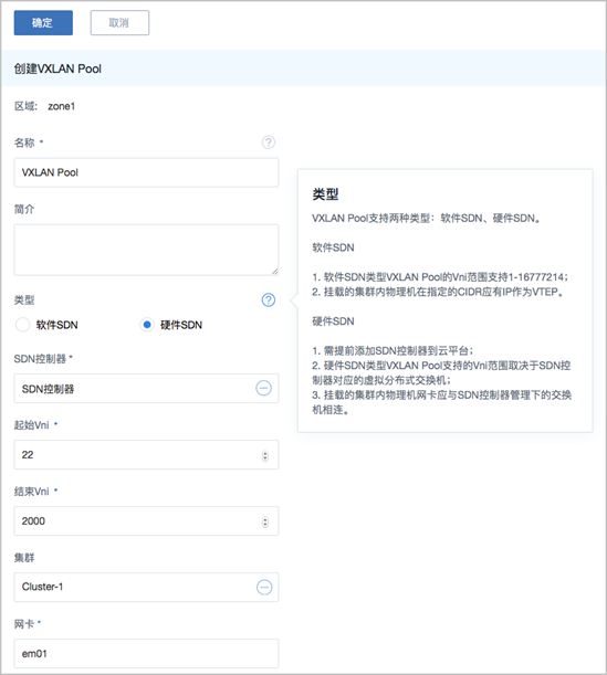 VXLAN Pool新增硬件SDN类型,相应VXLAN网络新增HardwareVxlanNetwork类型,基于该VXLAN网络创建的三层私有网络目前支持扁平网络及相应网络服务,不支持云路由网络类型。