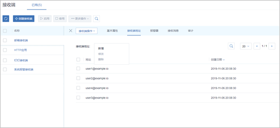 同时,云平台支持批量管理邮箱接收端地址,在接收端地址管理页面,支持查看/新增/修改/删除接收端地址。