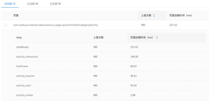 从两个实现的页面分别启动400多次的数据中可以看到,原生实现(AllCategoryActivity)的加载时间中位数为210ms,Flutter实现(FlutterCategoryActivity)的加载时间中位数为231ms。考虑到目前我们还没有针对FlutterView做缓存和重用,FlutterView每次创建都需要初始化整个Flutter环境并加载相关代码,多出的20ms还在预期范围内:
