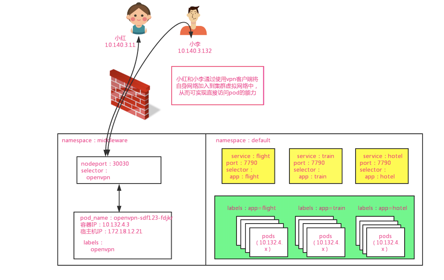 我们在集群的 middleware 空间下以 nodeport 的方式部署了 VPN Server,并给客户端分配了 10.140 的网段