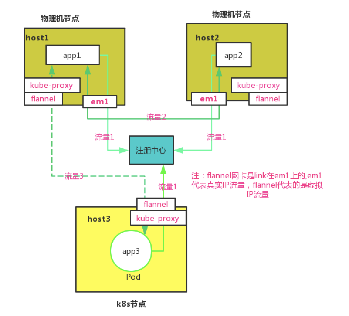流量 1 是部署在物理机和 K8S 容器里的应用注册服务的线路