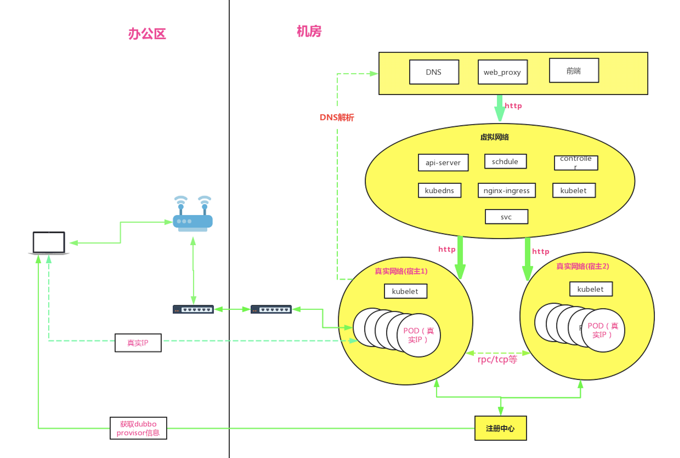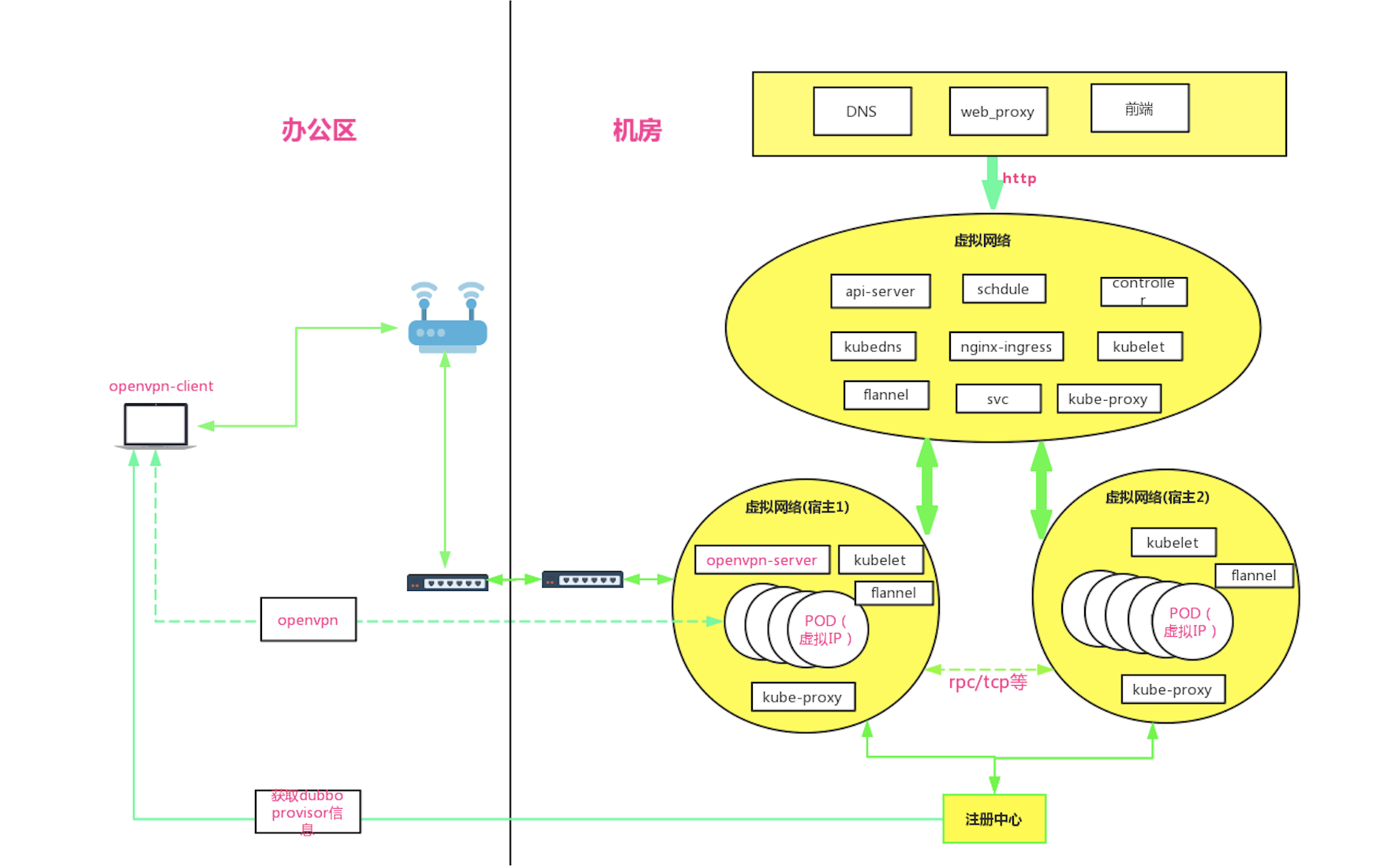 改造后开发环境与机房 K8S 集群之间的网络架构图如下所示:
