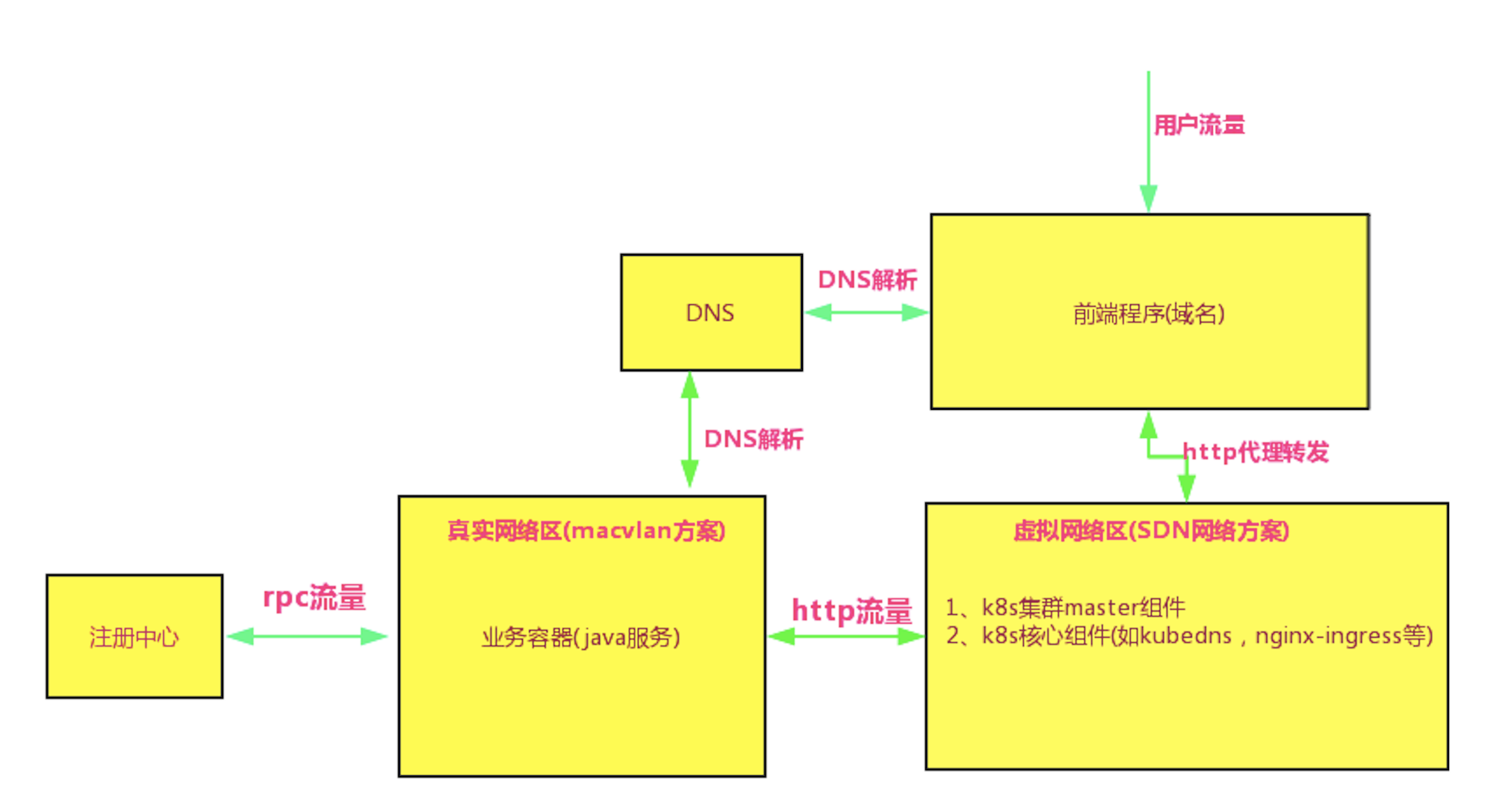 K8S 集群分为了虚拟网络区 (运行 K8S 集群管理组件) 和真实网络区 (运行业务容器)