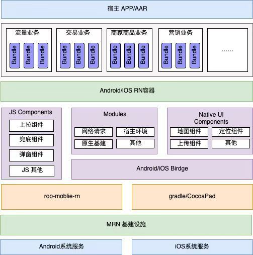 - 最下层是Android/iOS系统服务层,因为MRN是跨端的,所以需要引入这一层。相对单一平台来说,由于MRN的引入,整个App的架构不可避免地需要考虑Android和iOS平台本身的差异性。