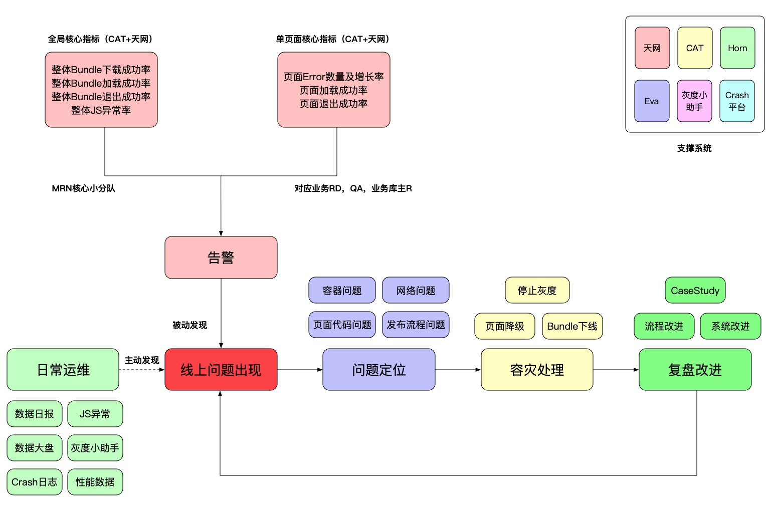 - 右下角是运维支撑,主要包括基建成功率监控、业务成功率监控、线上问题追踪、网络降级等。这块相对于单一平台来说,保持了一致性,区别在于:需在原有的基础上,增加MRN的监控运维。