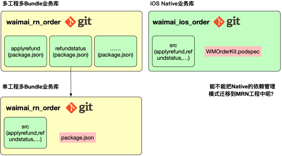 随着外卖MRN页面规模以及参与人规模的进一步增大,多工程多Bundle方案的缺点日益凸显。特别对于那些前端技术底子相对薄弱的团队来说,依赖管理问题会变得很头疼。在这种情况下,单工程多Bundle的方案就应运而生了。