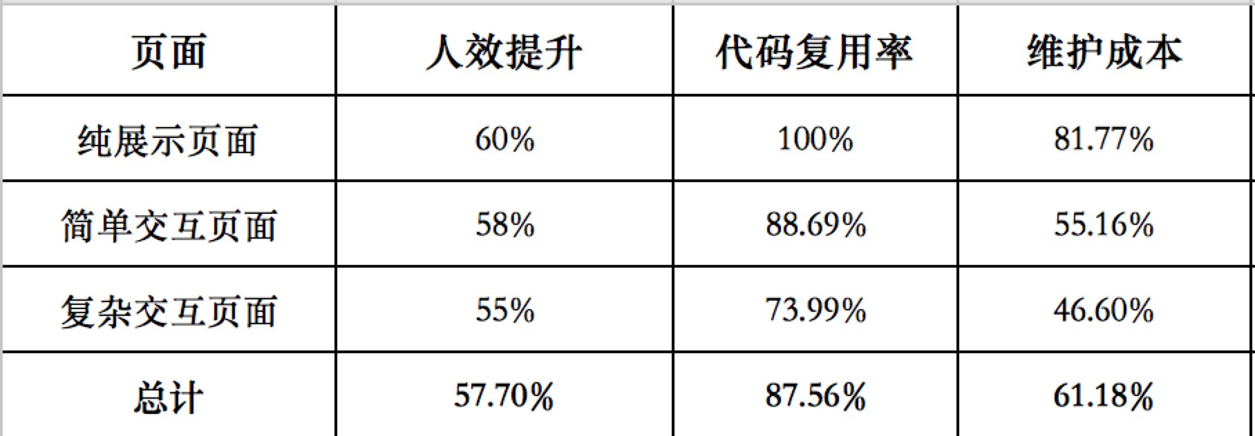 引入MRN,提升了本地的开发效率,但同时也增加了工程的复杂度,所以总体来说真的能提升实际开发效率吗?在完成几十个RN页面的开发后,总结了一些公式,希望可以给其他团队一些结论性的参考。首先设定三个方面去考量:人效提升、代码复用、维护成本衡量,将外卖的所有MRN页面加在一起,取平均值,可以得出较为准确的结论: