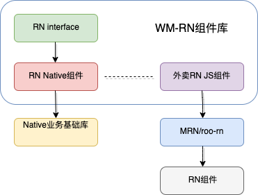 上图是我们外卖组件库的架构图,最底层依赖Android和iOS的原生服务;然后是MRN基建层,用于抹平Android和iOS系统之间的差异;再上一层则是外卖组件库及其依赖,如平台组件库和打包服务,组件库分为两类:纯JS组件和包含JS和Native的复合组件。再上一层则是Android和iOS的MRN容器,它提供了上层Bundle的运行环境。整个组件的架构思路,是利用中间层来屏蔽平台的差异,尽可能地使用JS组件,减少对原生组件的依赖。这样可以有效地减少上层业务开发时对平台的理解。接下来,我们主要讲一下WM-RN组件库: