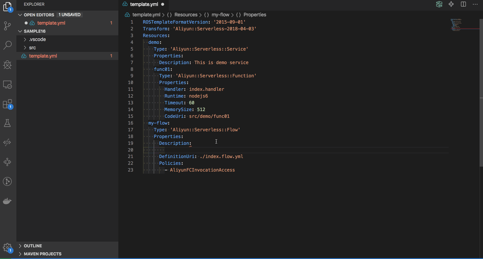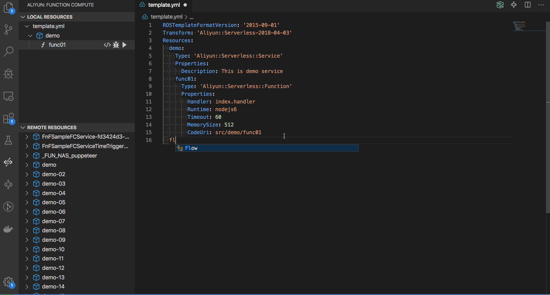 模版文件 template.yml 提供针对函数工作流的语法提示