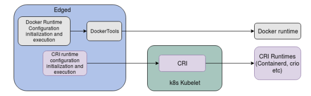 在边缘端Edged中添加了CRI的集成,当在资源受限的边缘节点无法运行现有的docker运行时是,用户可以选择运行更轻量级容器运行时,如Containerd、Cri-o等。