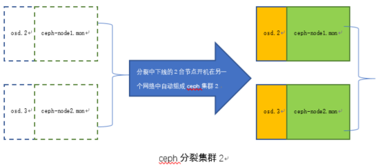 ceph 集群分裂,本来就是一个违反常理的事情。从ceph的设计原理上就是预防分裂,而且很对分裂有一个专有名词“脑裂”。