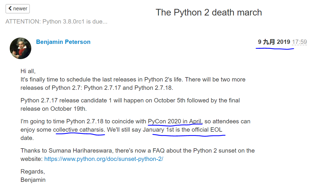 其实,这个决定并不是最近确定的,早在 2019 年 9 月,Python2 的版本经理 Benjamin Peterson 就公布了这个计划,这里是当时的邮件组截图: