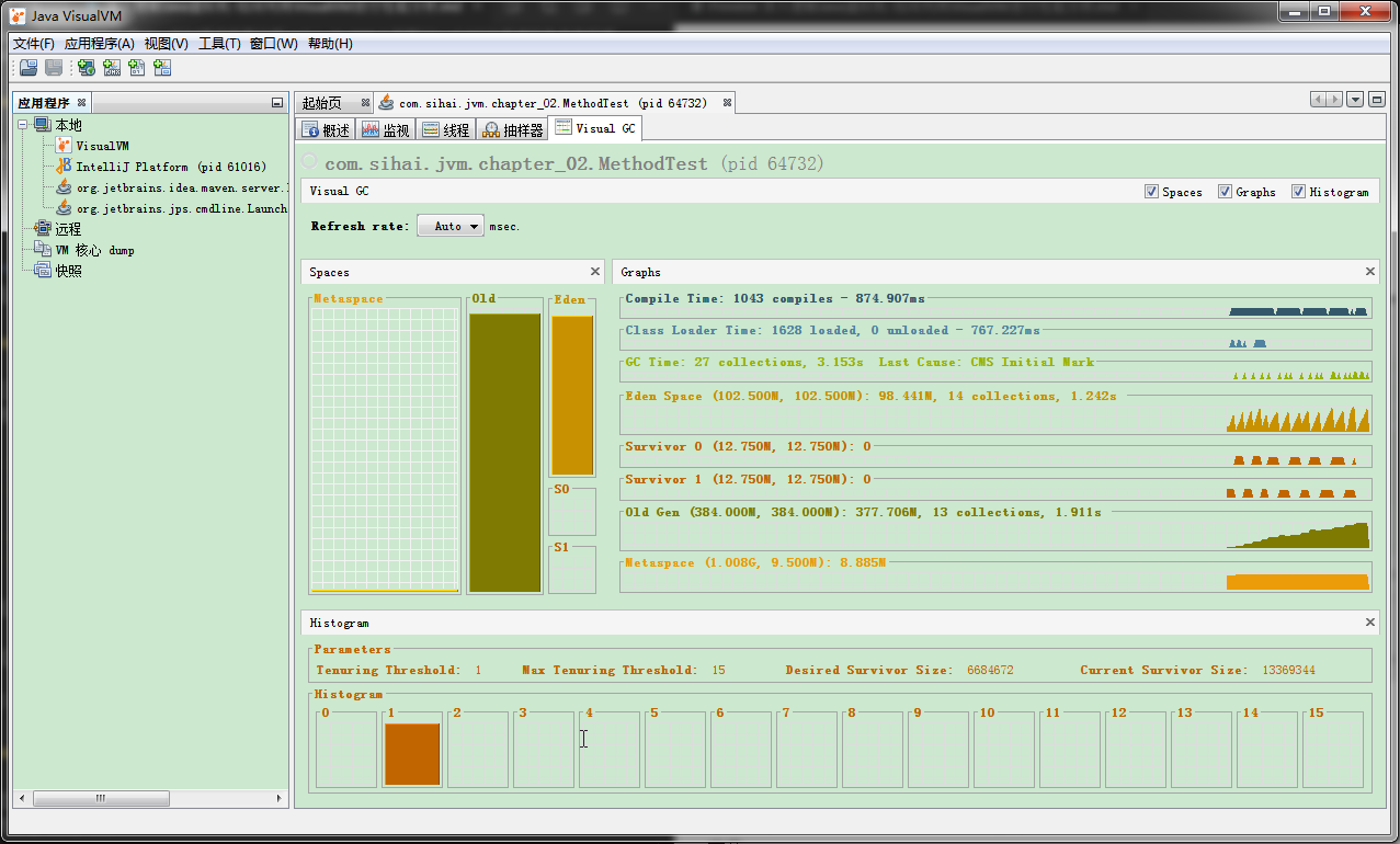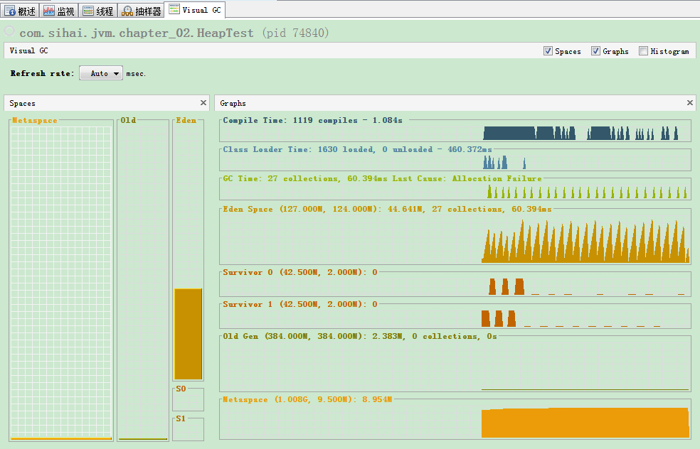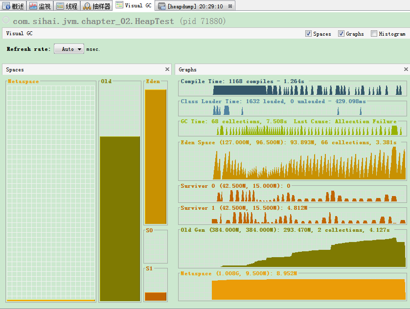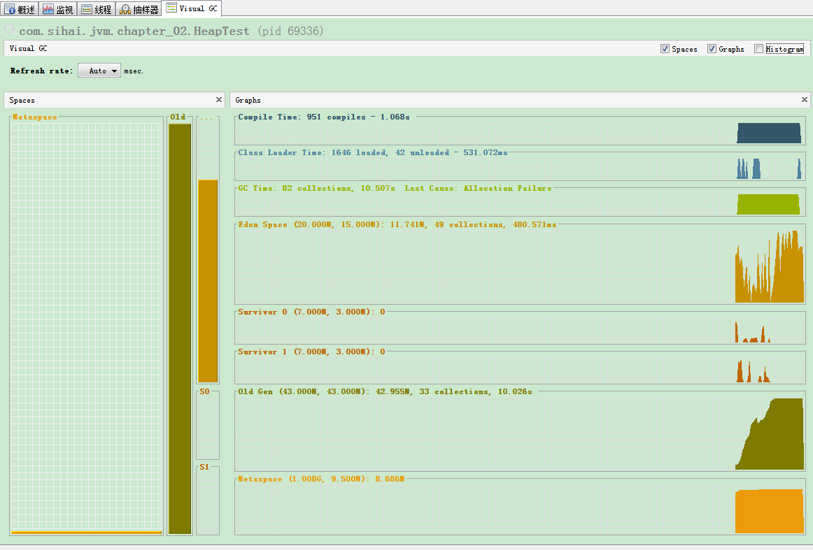 - Graphs(Compile Time(编译时间)、Class Loader Time(类加载时间)、GC Time(垃圾收集时间)、Eden Space、Survivor 0、Survivor 1、Old Gen、Metaspace)