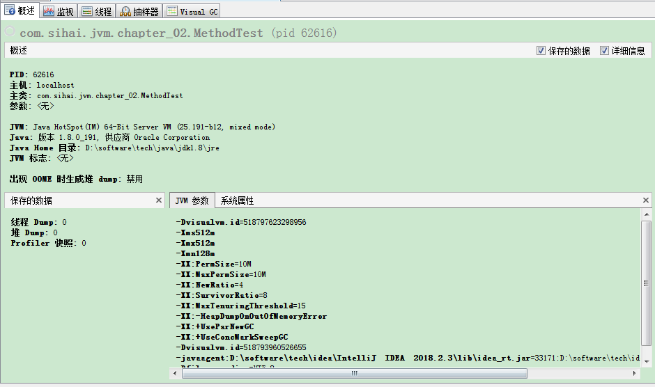 如上图所示,概述基本上都是我们的系统属性、运行程序时设置的JVM参数等信息的展示,所以,这一部分可以让我们查看这些信息。