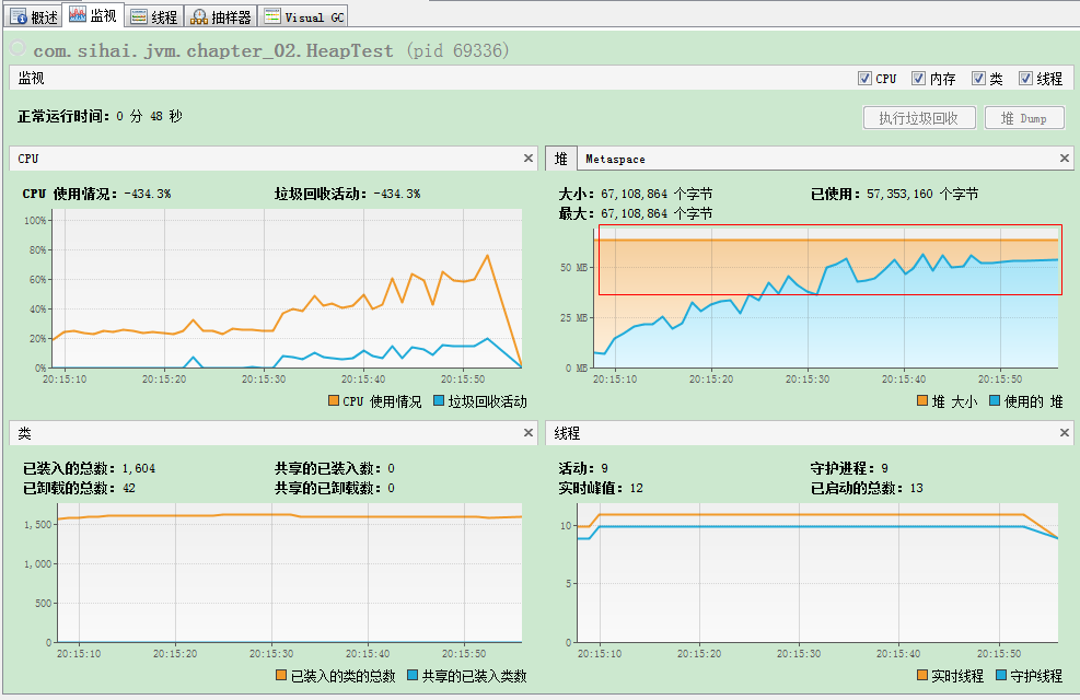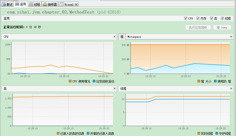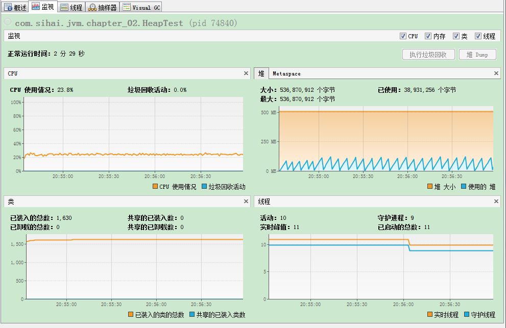 因此,我们可以利用这个界面查看cpu情况好不好,更重要的是,我们可以查看堆的使用情况,这对于我们分析JVM还是非常重要的。