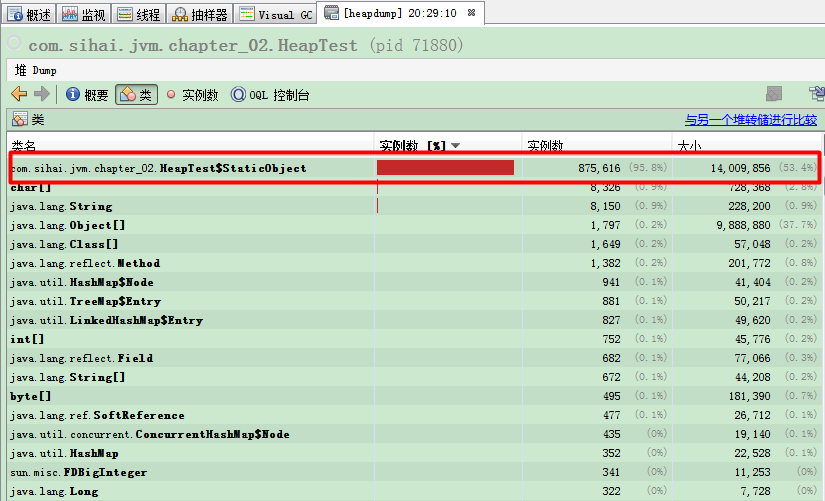 点击堆 dump这个按钮就会生成 dump文件,我们可以分析类及对象的一些情况。