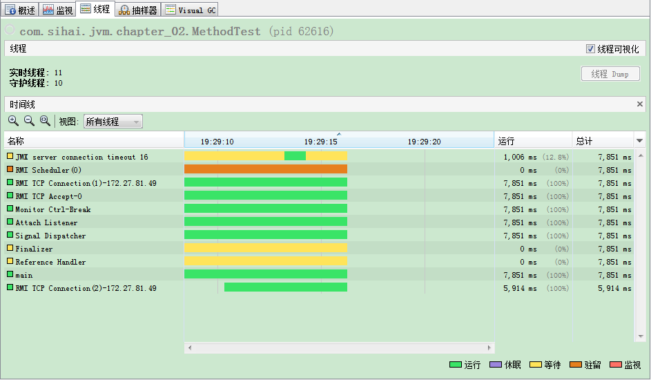 如上图所以,可以看到所有的线程的情况,是运行、休眠、等待、驻留、监视等情况。