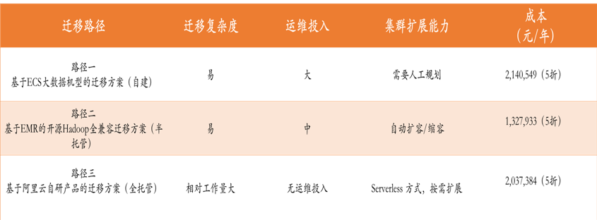 客户现有的大数据系统是利用开源系统自己构建的数据分析系统,日常面临着性能不足的问题。阿里云设计了三条路径,路径一是基于ECS大数据机型的迁移方案,即客户自建方案;路径二是基于EMR的开源Hadoop全兼容迁移方案,即客户半托管方案;路径三是基于阿里云自研产品的迁移方案,即客户全托管方案。从迁移复杂度、运维投入和集群扩展能力等多个维度来看,最终推荐了路径二。
