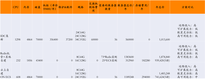 客户目前的中间件主要是部署在线下的服务器上,日常使用过程中,也时常面临着扩展能力低、灵活性不强的问题。综合对比了云上Redis托管配合其他自建,以及客户完全在云上自建,两种方案的成本等因素,我们推荐了前者。主要对比的方案优劣如下: