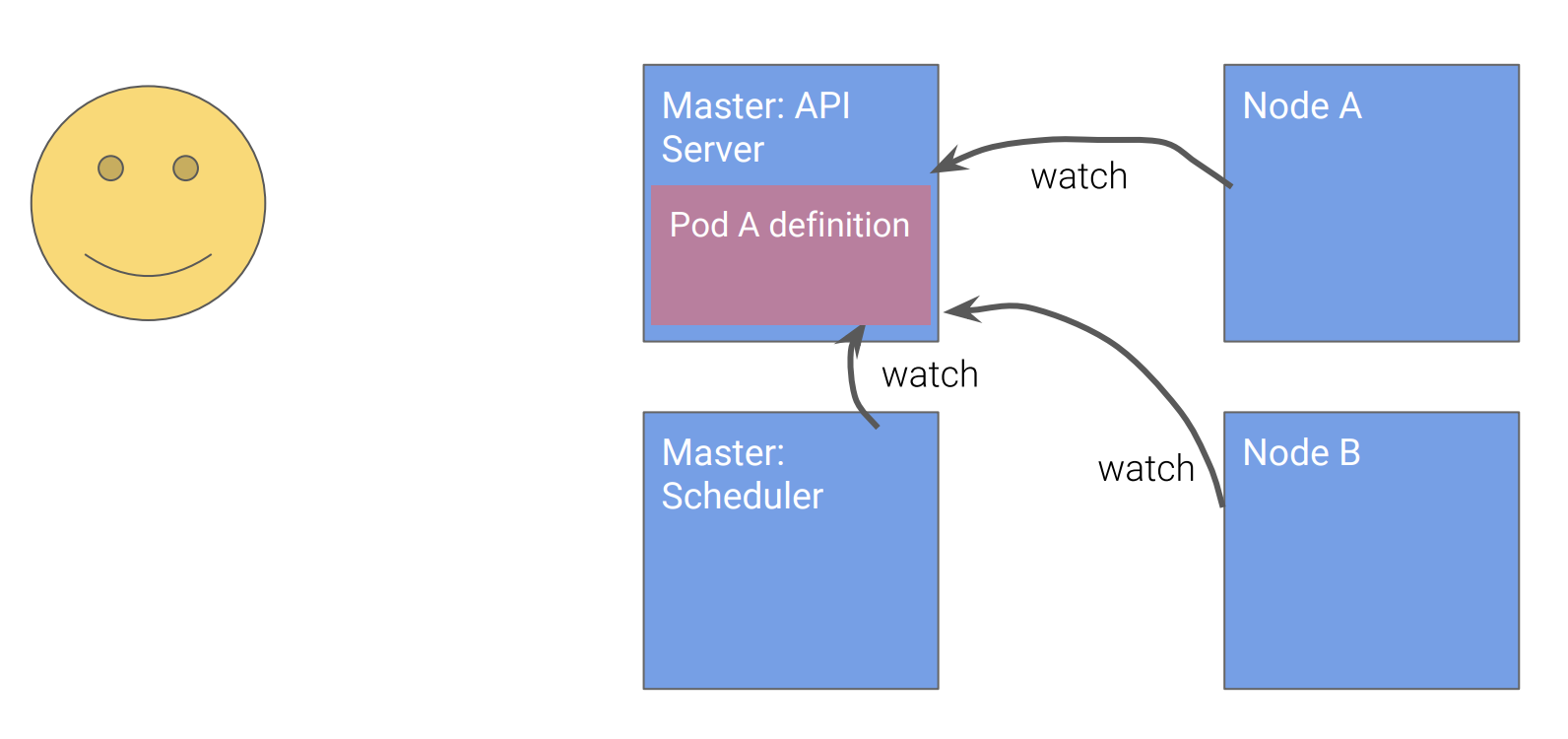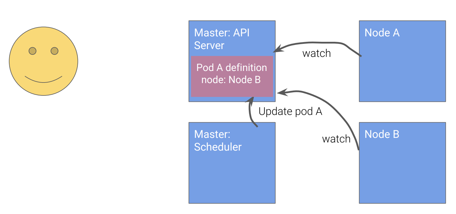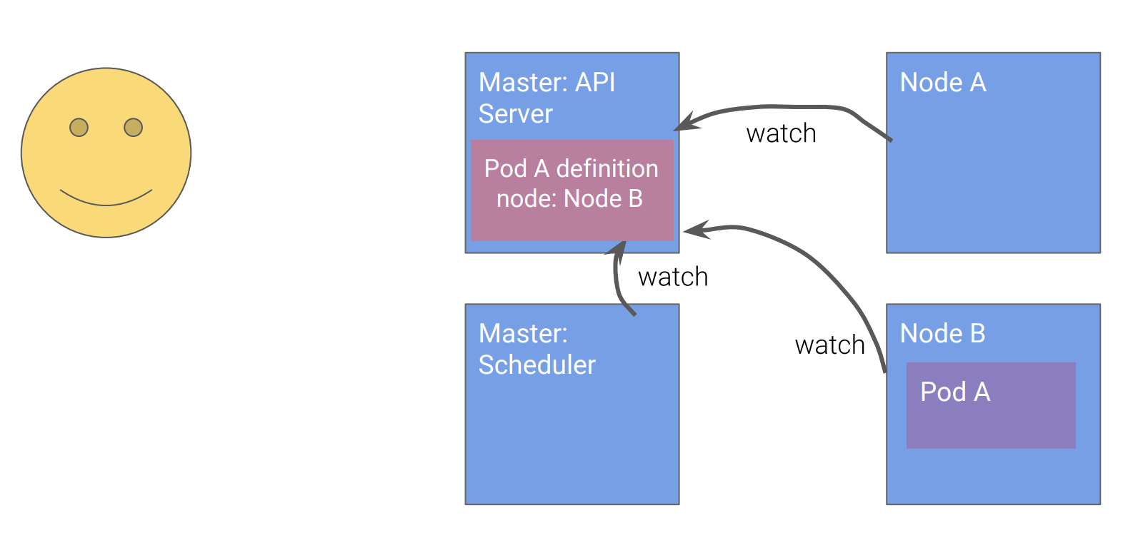 Scheduler通过API观察到Pod A的定义,通过调度运算,决定要在Node B上创建Pod A,并通过API更新主节点上的Pod A的定义。