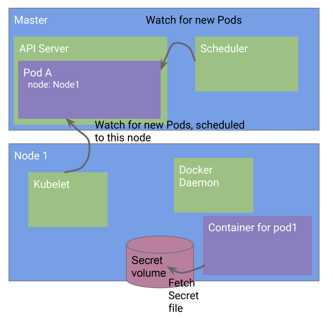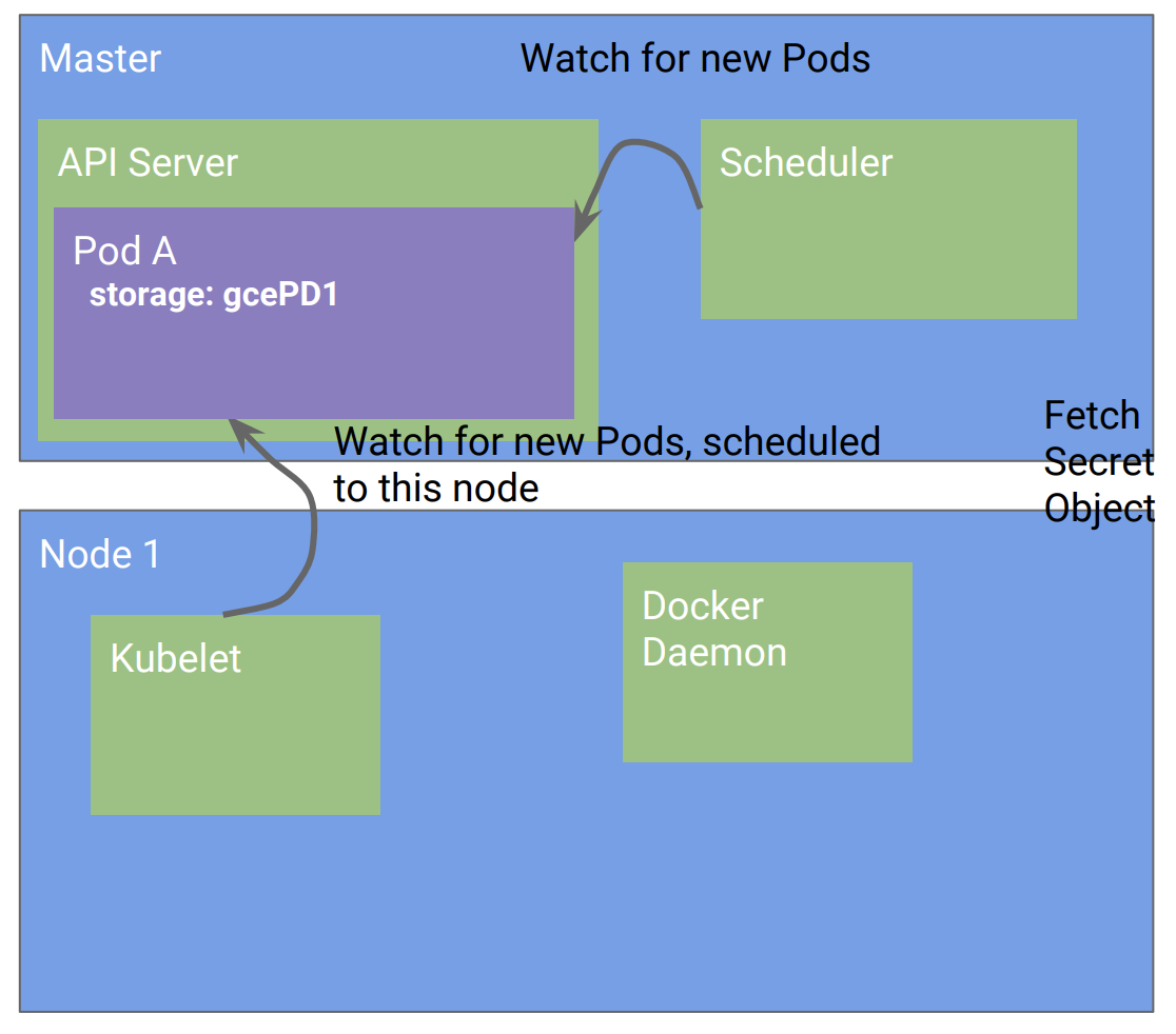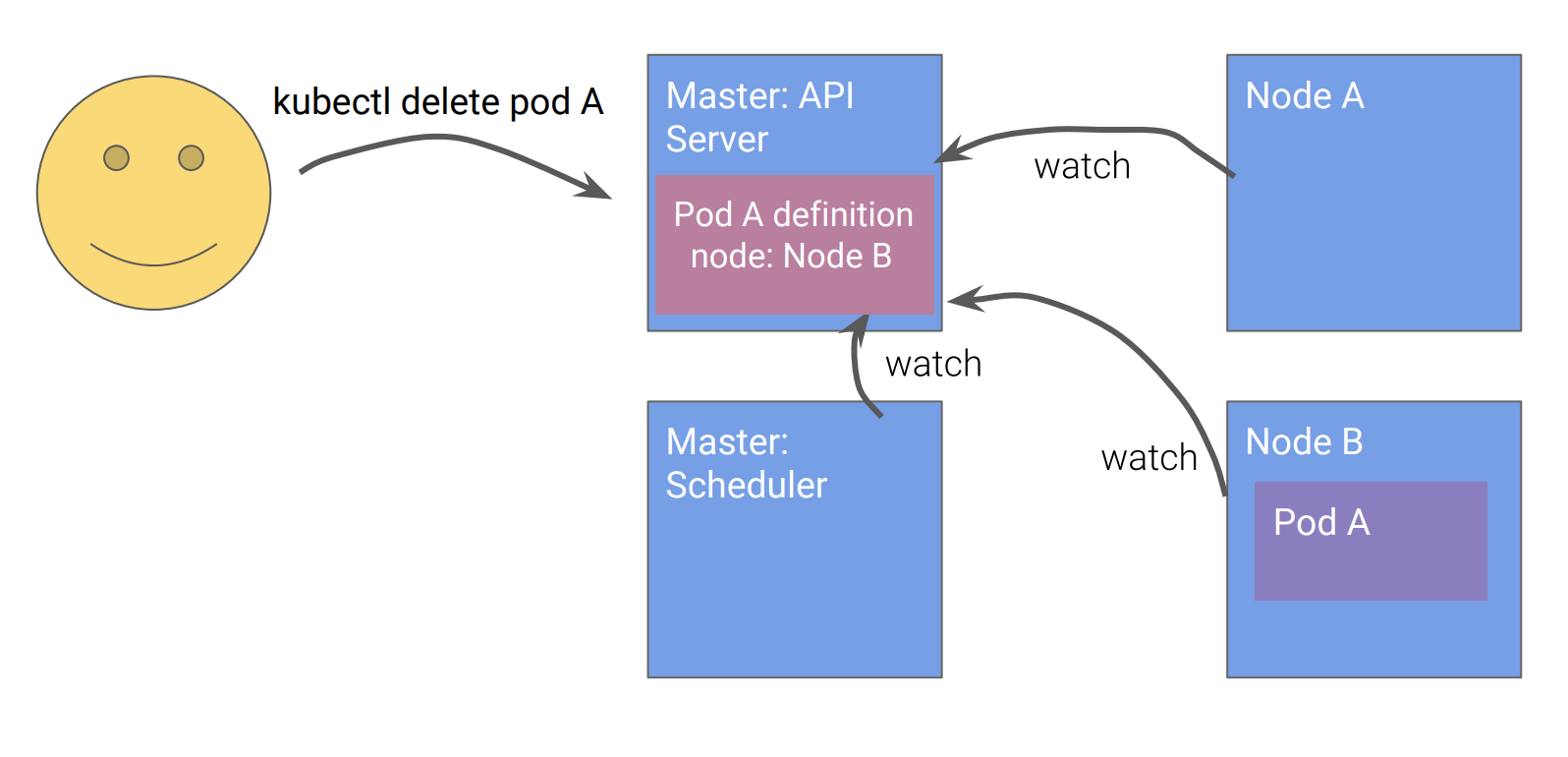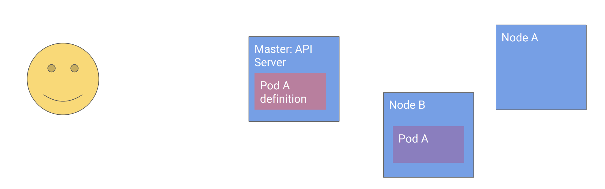 Scheduler通过API观察到Pod A的定义,通过调度运算,决定要在Node B上创建Pod A,并通过API更新主节点上的Pod A的定义。