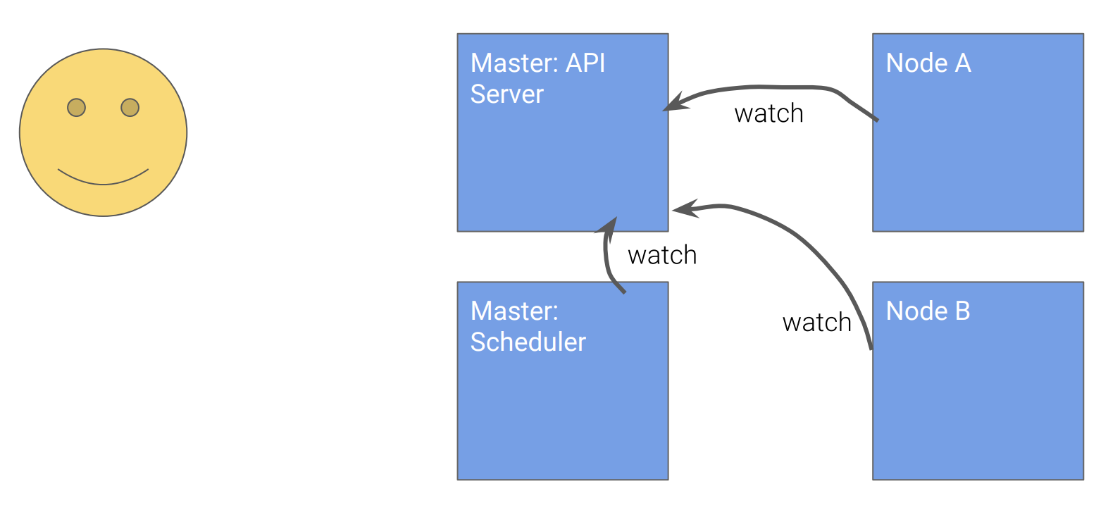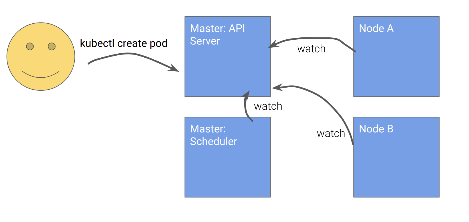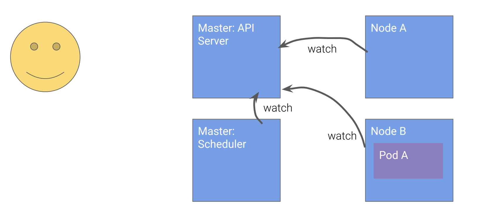 这里需要注意主节点只是存储了Pod的定义声明,而不会向节点B发送命令,如果那样做,主节点就会变得和我们之前提到的客户端一样,复杂而脆弱,且难以扩展。这就引入了K8s的第二个设计原则: