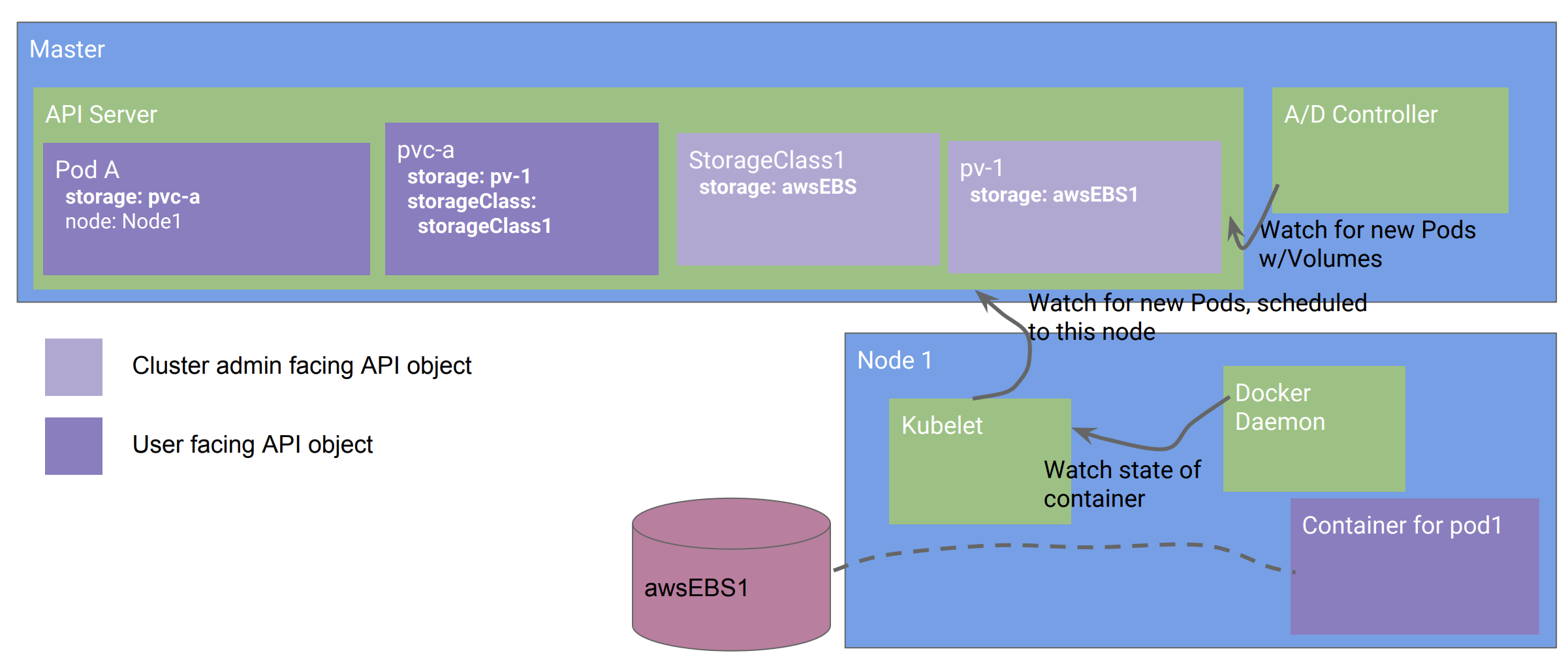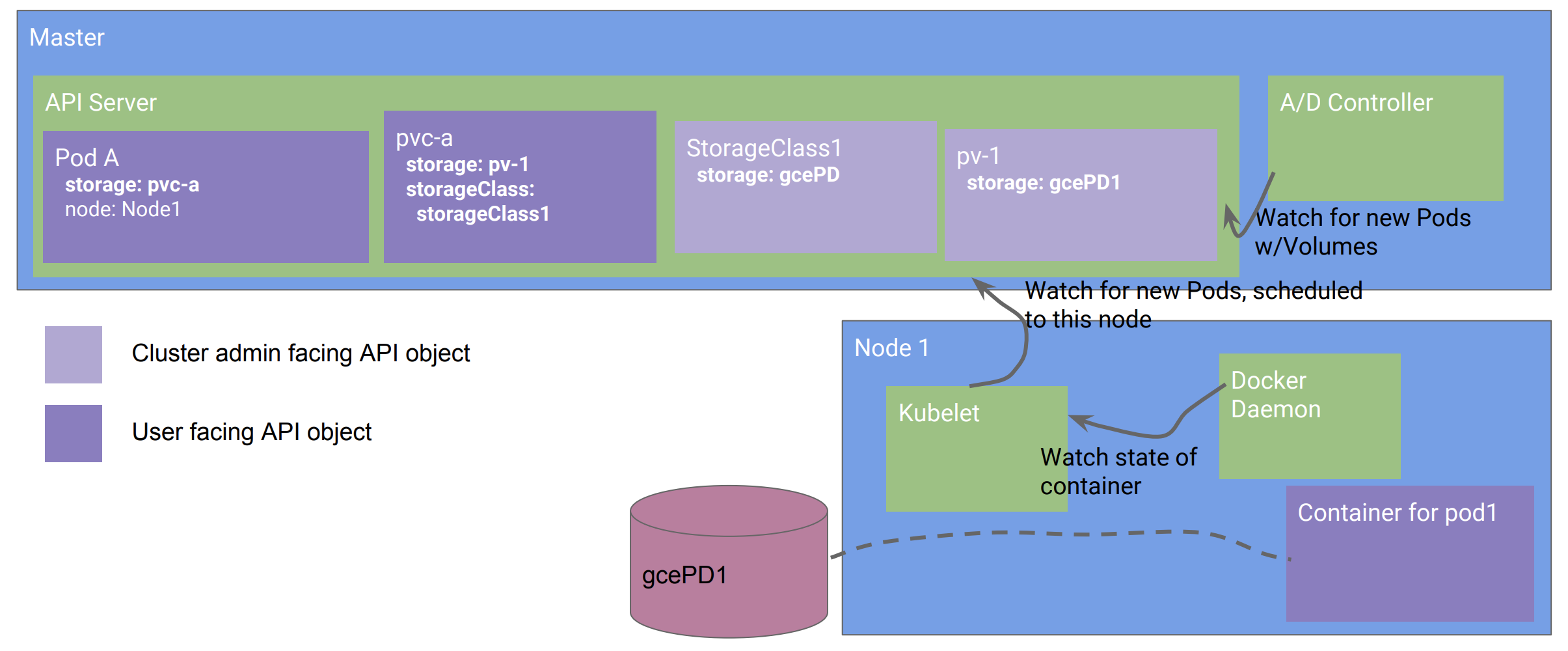 如上图所示,通过PVC的抽象,用户Pod并不直接引用GCE PD或者EBS,这样就使得该Pod可以在不同的基础架构中互相迁移,做到可移植。就像操作系统一样,该设计使得系统应用和底层的硬件或者架构实现分离解耦。