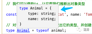 const mouse: Animal = { type: 'mouse', name: 'Jerry' };在visual studio code中,可以看到ts帮我们正确地推导出了Animal类型: