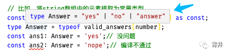 const ans2: Answer = 'nope';// 编译不通过其中Answer的类型定义是:
