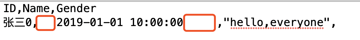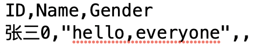 写入的数据包含逗号,双引号等特殊字符时,导出的 csv 文件用文本编辑器打开,数据会用双引号包裹起来, 如下所示: