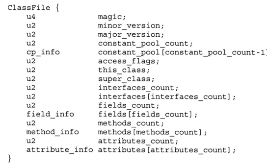 每个class文件都对应如下结构(JDK 8,不同版本结构不是完全一样),其中包括两类数据类型:u(1/2/4), _info; u 后面的数字表示n个字节,而 每个_info 又有特定的格式。 具体可以参看《java虚拟机规范 se 8》第4章内容。