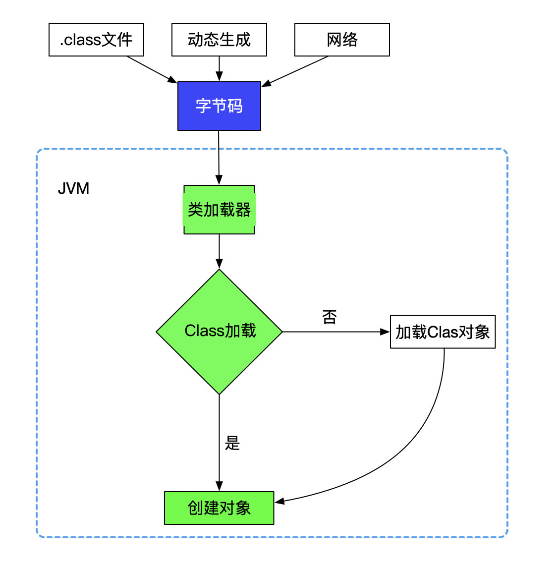 前面的例子中,这种在运行时,确定类的实际类型是虚拟机的动态分派机制。 为啥对象可以找到类型信息呢,因为普通对象是被Class对象创建的,而Class对象包含了类的有关信息。下图为Class对象的加载过程,当我们在创建普通对象时,会先判断此类的Class对象是否加载(每个类都有一个Class对象),如果已经加载,就使用Class对象生成普通对象;如果未加载,就需要通过字节码创建Class对象,再生成普通对象。在虚拟机层面,则是运行时,把变量 new ChildClassTest()的引用存放于 LocalVariableTable 的 slot中,执行print时(其实就是执行toString()方法),实际是执行invokevirtual 指令,找到方法的实际接收者,再执行toString()。而 invokevirtual 解析的过程,根据《深入理解java虚拟机》中的描述过程如下:
