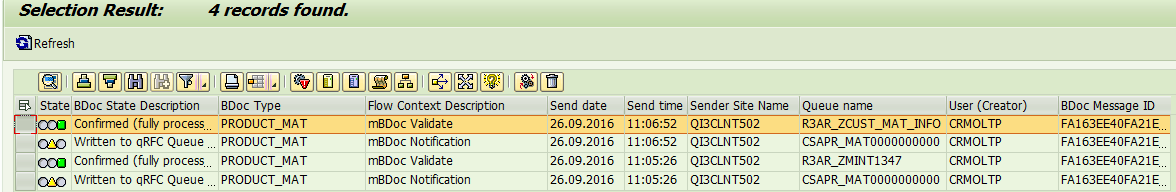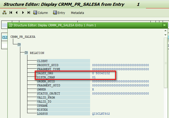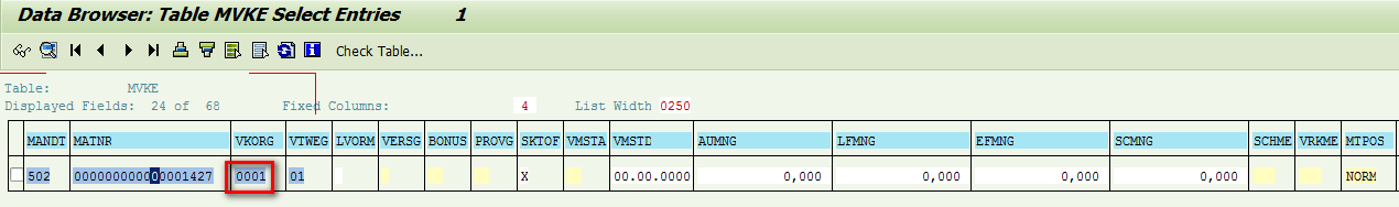 Go back to ERP and check table MVKE, we can find the sales organization 0001 and channel 01 is assigned to this product correctly.