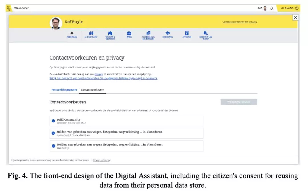 Flemish 政府开发了一种数字助理,可提供市民与不同政府部门互动。一个有用的例子是向公民提供有关公共服务状态的通知。由于大多数公民几乎没有与政府之间的互动,相比较与私营部门之间的互动, 联系信息以及有关其偏好的信息通常已经过时。用了 SoLiD 之后,角色互换了,市民的 Pod 成为主要联系信息和偏好的来源。该用例解决了第一个挑战, 避免了用户必须在各个公共和门户网站中保持其数据的最新状态。