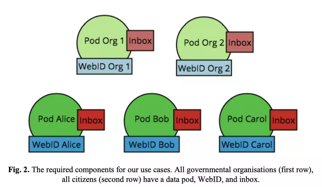 对于我们的用例,我们假设所有公民都可以使用全局唯一的统一资源标识符(URI)(称为WebID)来唯一标识。该 WebID 指向有关公民的更多详细信息的,尤其是指向个人数据柜(Pod)。此外,我们假设所有政府部门和组织都具有 WebID 和 Pod。所需的组件 Fig2 所示。通常,SoLiD Pod 具有公共收件箱,任何人都可以在其中发布消息。然后消息只能由所有者读取、修改和删除。我们假定所有 Pod 都满足此约定,因为我们使用了此约定来保证用户之间的通信。