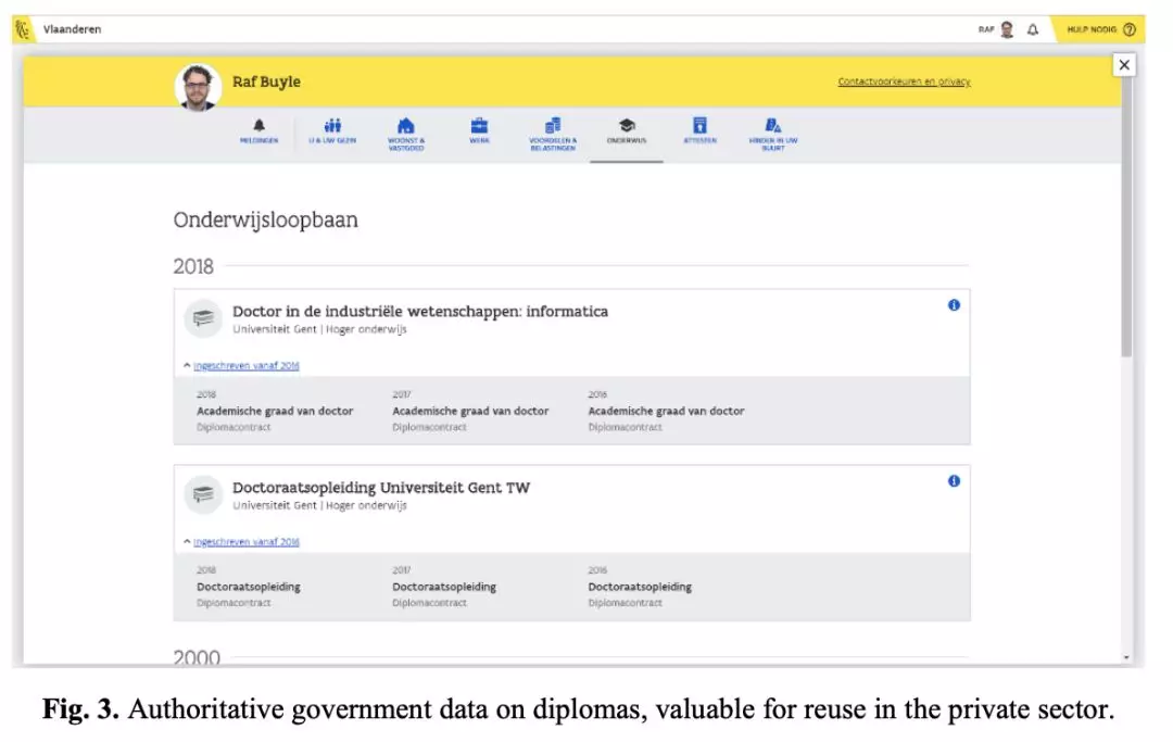 比利时北部联邦国家和地方政府旨在增强公民的能力,使其可以在公共服务、银行、健康保险和电信提供商等不同环境下在线重用其个人信息。政府通常是个人数据(例如住所、医疗信息等)的托管方,这些信息存储公共行政部门的各种信息系统这种。Flanders 的政府管理部门之间允许共享和重用数据,这样减轻了公民的管理行政负担,是欧洲实施“仅一次原则”的体现 。但是实际上,公共行政部门正在努力控制公民的数据。