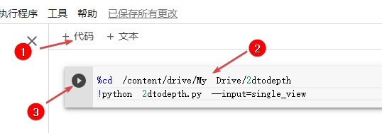 %cd /content/drive/My Drive/2dtodepth !python 2dtodepth.py --input=single_view第一行进入工程目录,第二行执行脚本