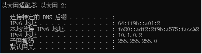 例如我在笔记本上启动的是1002节点,通过 ipconfig 命令可以看到 虚拟网卡已经成功设置了虚拟ip 10.1.0.2。