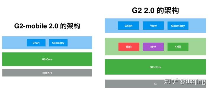 V1.0 版本仅仅延续了 4 个月,2016 年 7 月我们就发布了 V2.0 版本,这个版本除了增加新的图表类型(面积图、k线图)外,还支持了坐标轴 ticks 的自动计算、动画和辅助元素。为了保持代码的大小,所有的模块都进行了分包,可以按需引用。其架构有较大的调整,我们将一些同 G2 共用的模块提取成 G2-Core ,其架构如下: