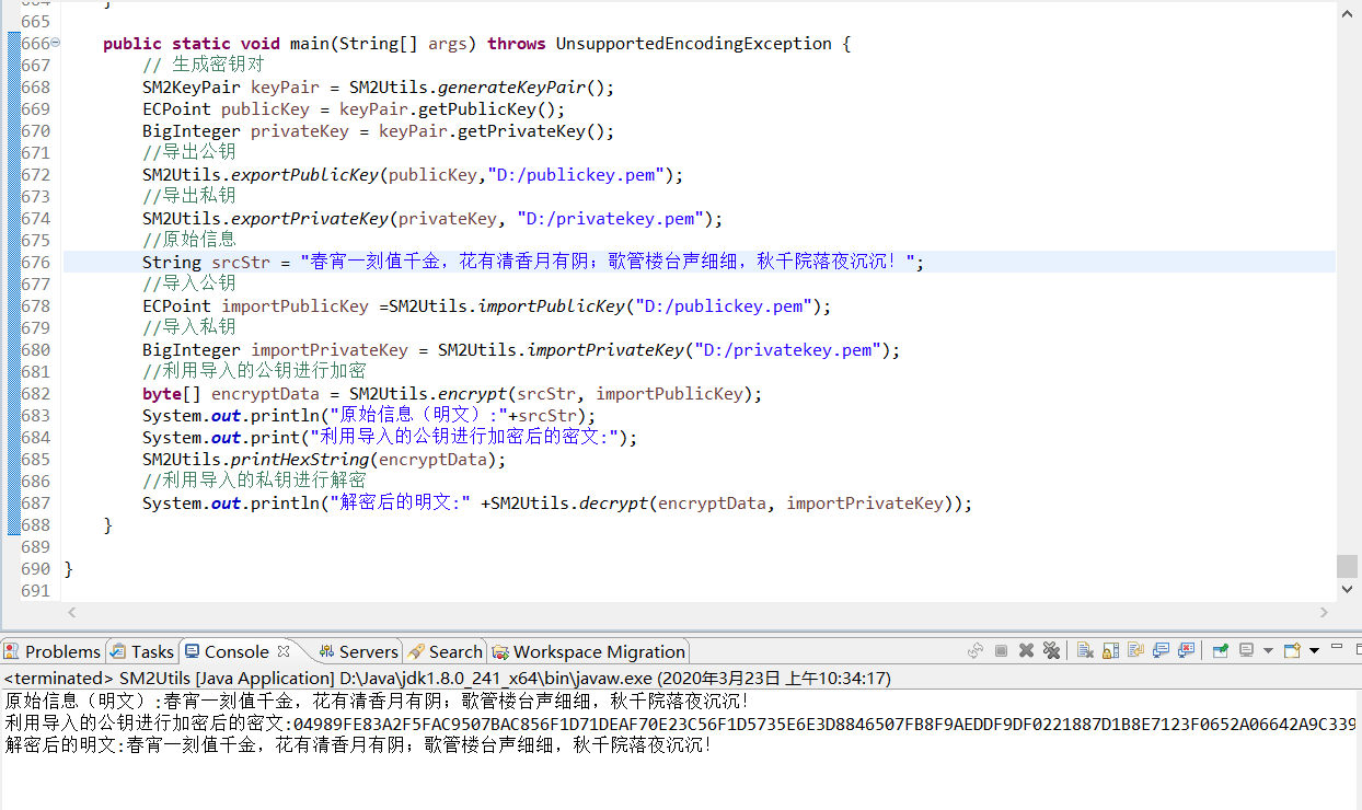 注意事项:对于相同原始信息进采用 SM2 行加密时,直接采用内存中生成的公钥进行加密后的密文与将该公钥导出成密钥文件后再导入系统进行加密的密文在内容上可能存在差异,但并不影响最终解密效果。