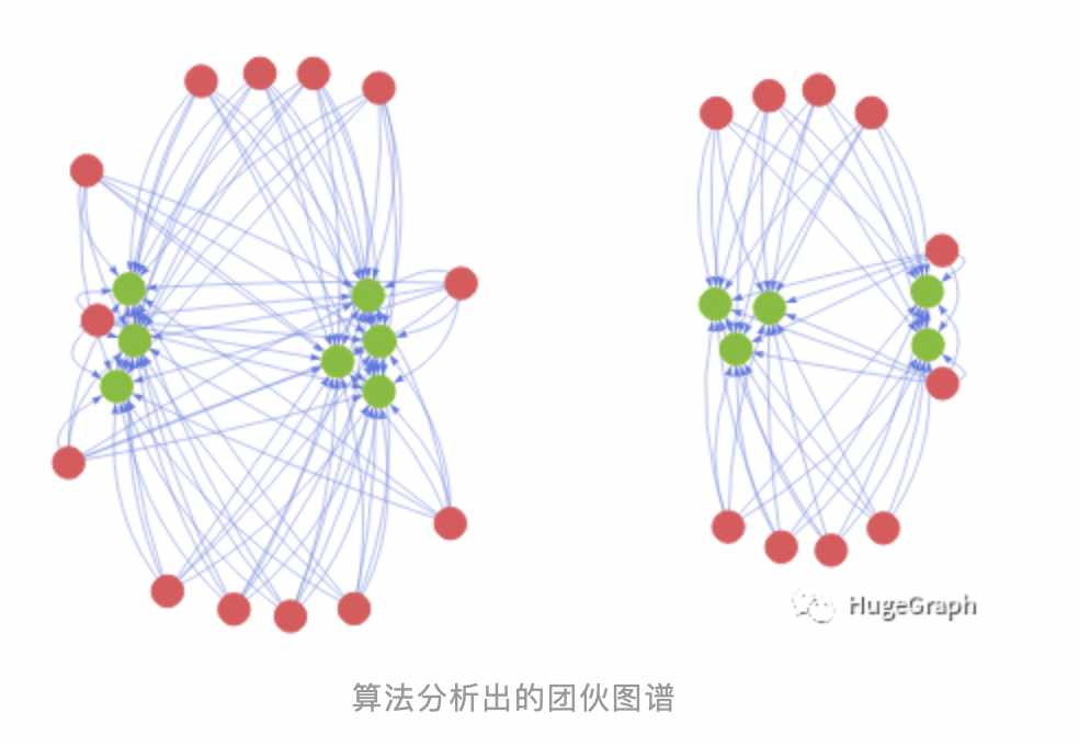 HugeGraph图数据库目前提供了两种社区发现算法:简单高效的标签传播算法LPA,以及基于模块度优化迭代算法Louvain。通过图的社区发现算法将用户划分为一个一个的群体(我们称之为团伙),然后根据团伙中各成员的风险评分综合计算整个团伙的风险程度,从而识别出高风险的欺诈团伙。