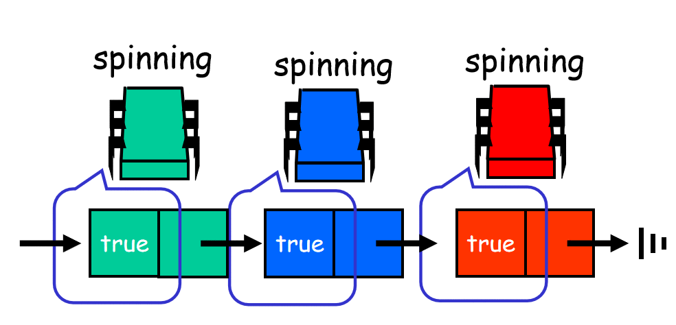 队列锁是一种可扩展自旋锁的方法,这种实现比BackoffLock稍微复杂一些,但是却有更好的移植性。在BackoffLock算法中有两个问题: