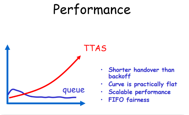 2. 临界区的利用率低:线程延迟时间长,导致临界区利用率低下。在队列中,每个线程检测其前驱线程是否已完成来判断是否轮到了自己。让每个线程在不同的存储单元上自旋,从而降低cache一致性流量。队列还提高了临界区的利用率,因为没有比要去判断何时要访问它:每个线程直接由队列中的前驱线程来通知。队列还提供了先来先服务的公平性。