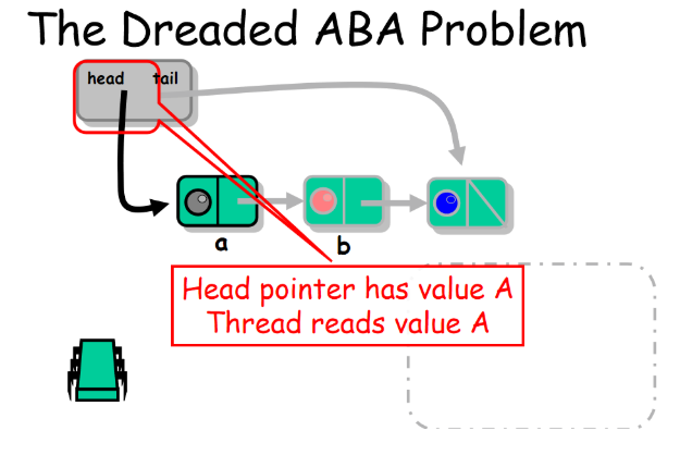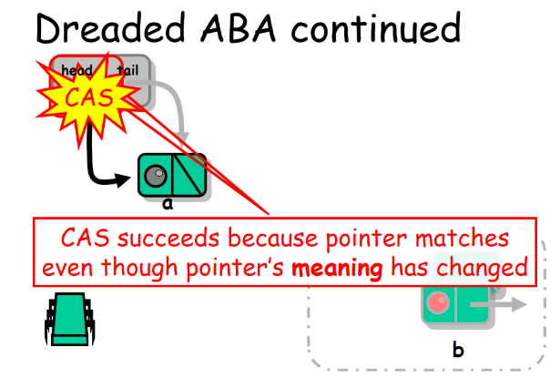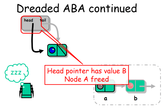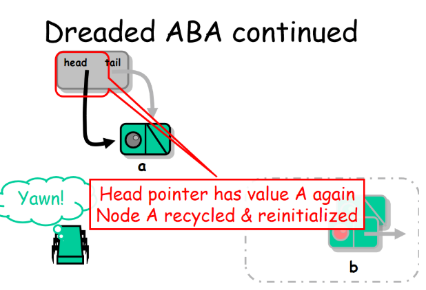 那么好如果我们使用上面说到的内存回收方案就会发生ABA问题。简单的介绍ABA问题:一个值原来是A,被别的线程修改成了B,又被别的线程修改成了A。最初看到这个值是A的线程被唤醒后发现值依然还是A就继续执行,不知道其实这个值已经被修改过很多次了。